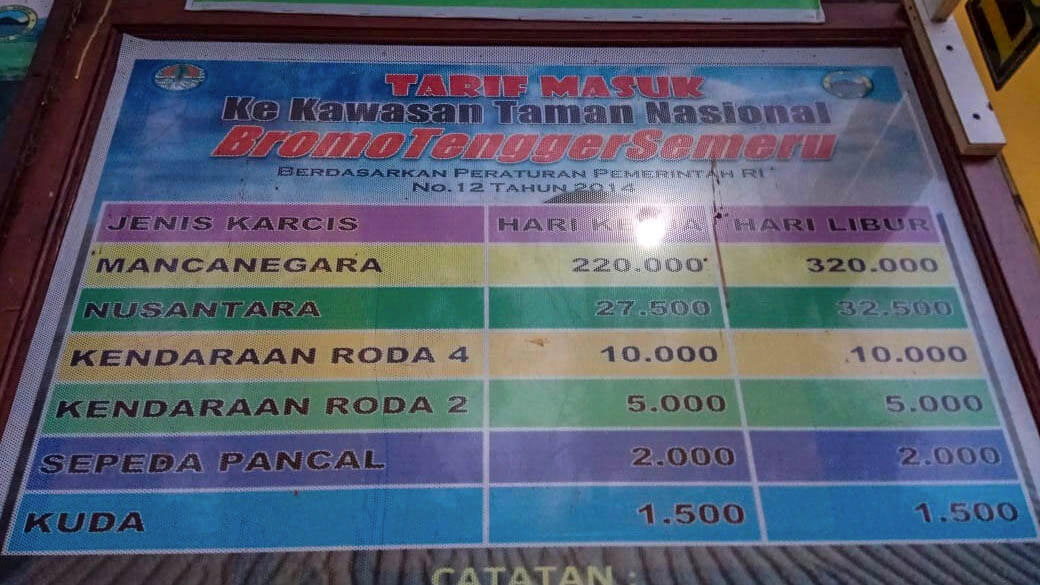 Ini nih yang seru kalau kalian ke sini, sekalian ke Gunung Bromo. Kalian hanya perlu membayar 1 kali restribusi masuk kawasan TNBTS. Nah tiket itu bisa kalian gunakan masuk ke kawasan wisata Gunung Bromo juga. Selebihnya kalian akan dikenakan biaya parkir sebesar Rp 5.000,- untuk biaya masuk TNBTS-nya. Tapi, wisatawan domestik dikenakan biaya Rp 27.500,- untuk hari biasa dan Rp32.500,- untuk akhir pekan/hari libur.