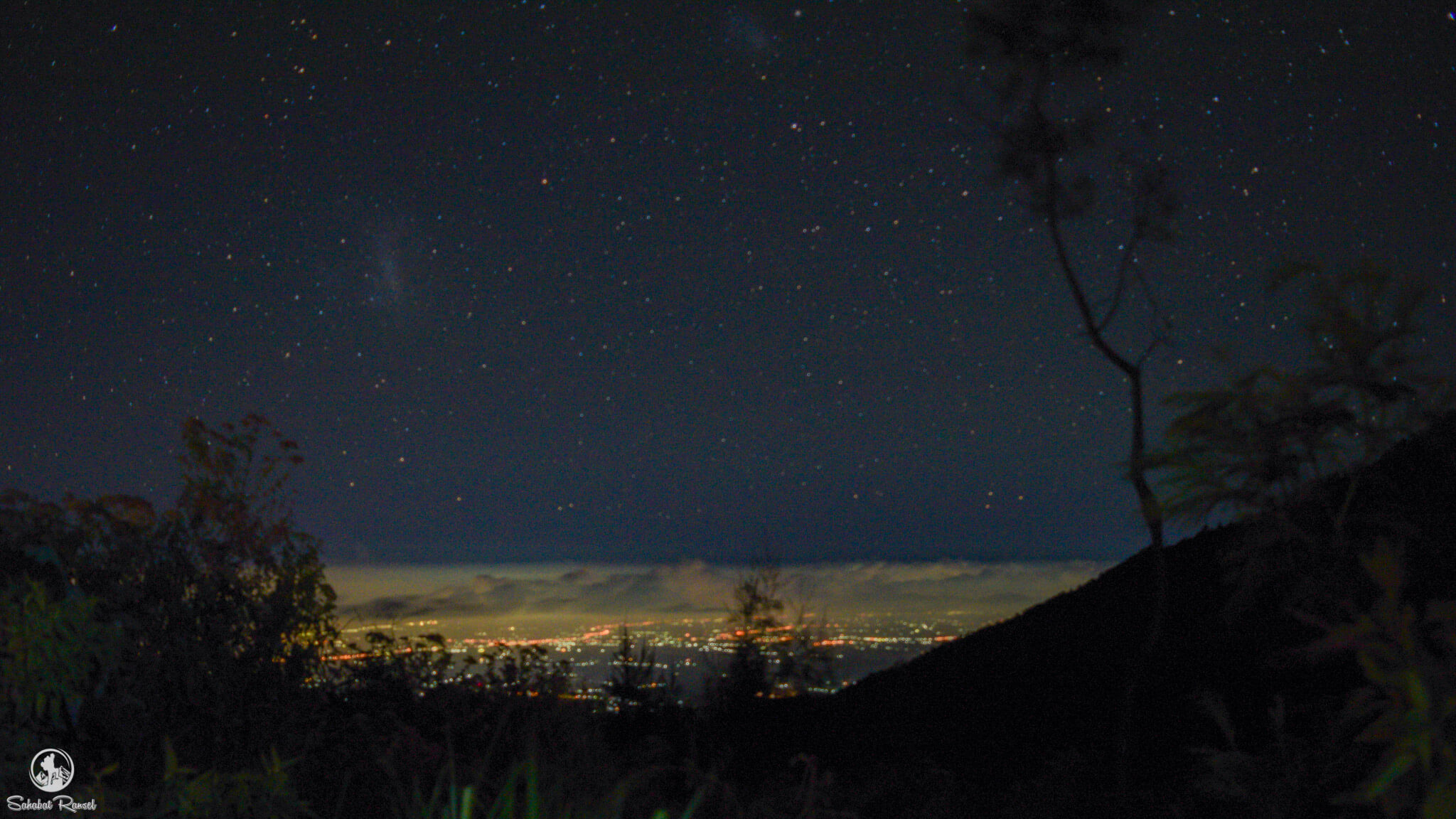 Di luar jalur yang lumayan menanjak, dan ditambah dinginnya malam yang senantiasa menemani perjalanan kami. Pemandangan di sepanjang jalur pendakian boleh diacungi jempol. Pemandangan Gemerlap Kota Banyuwangi dan bintang-bintang bisa kalian nikmati sepanjang perjalanan. Ada satu foto yang sempat saya abadikan. Ya, meskipun hasilnya juga ala kadarnya, karena dalam perjalanan ini pertamakalinya saya belajar menggunakan kamera, jadi harap dimaklumi ya hasilnya. 😀