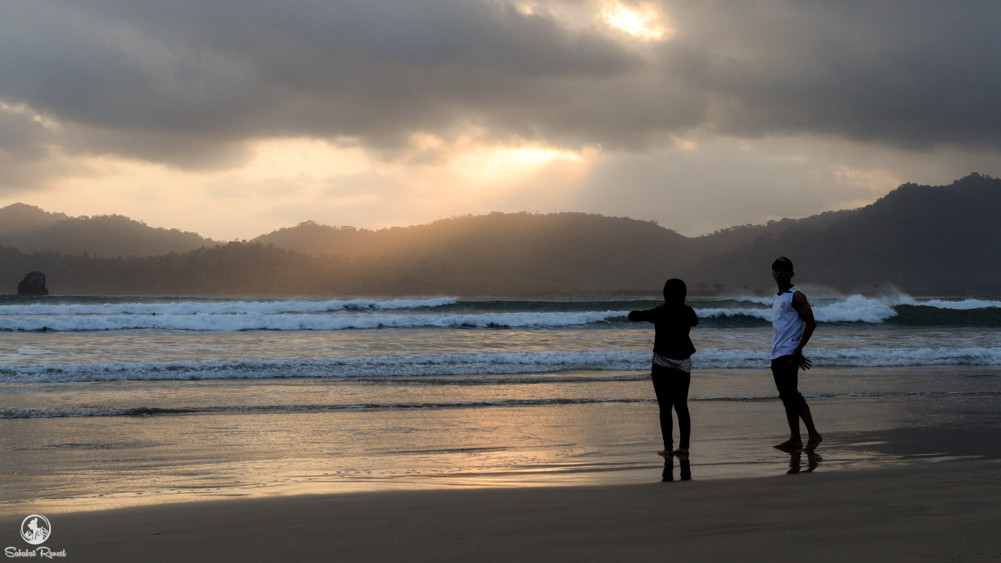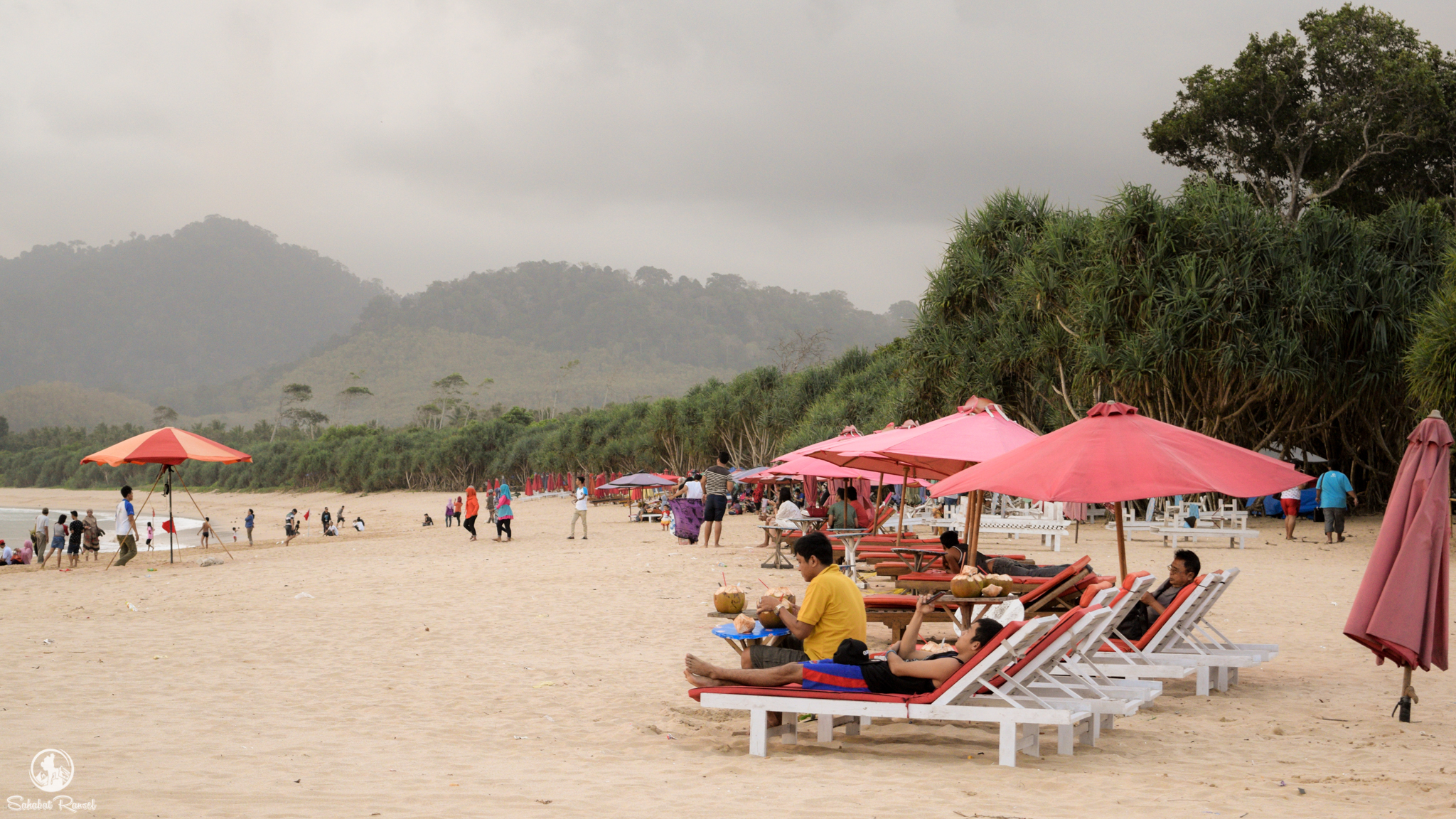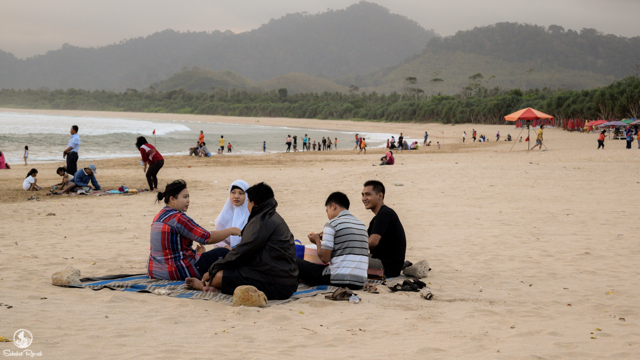 Banyak yang mengatakan, waktu yang tepat untuk kita berkunjung ke pantai ini adalah sore hari ketika matahari tenggelam. Tapi, sangat disayangkan cuaca kurang bersahabat ketika kami datang ke sana. Awan hitam menutupi langit di atas pantai. Tapi dengan cuaca seperti itupun, kami masih bisa menikmati indahnya sore hari di sini. Selain menjadi wisata keluarga, di sini juga banyak warga sekitar yang turut bermain di pantai. Sore itu, kami pun melihat beraneka ragam pengunjung. Mulai dari yang memang datang untuk berwisata, anak-anak muda yang latihan bela diri, sampai banyak juga anak-anak yang bermain di tepi pantai. Tapi perlu diketahui, ombak di sini bisa digolongkan ombak yang besar. Jadi, saya sarankan untuk berhati-hati bila bermain air.