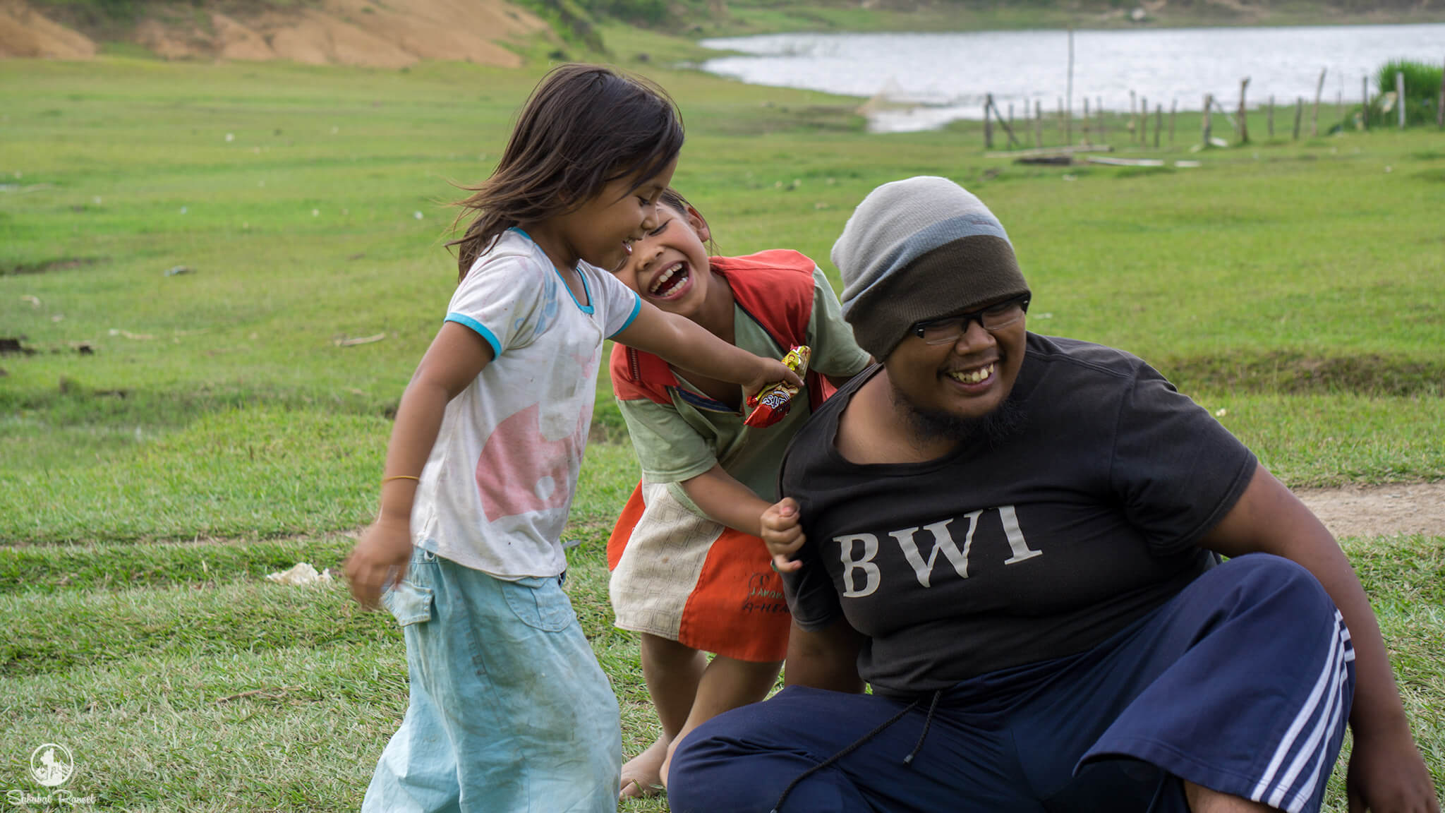 Saya sendiri, sih, bukan tipe orang yang bisa mengajak bermain anak kecil. Akan tetapi, karena pada saat itu Om Bukrie sedang membuat timelapse, yang mana bakal kurang bagus hasilnya bilamana adik-adik kecil ini lalu-lalang di depan kamera. Alhasil, saya berusaha membuat mereka bermain dengan saya, mulai dari kenalan, minta gantian gendong, sampai bernyanyi bersama.