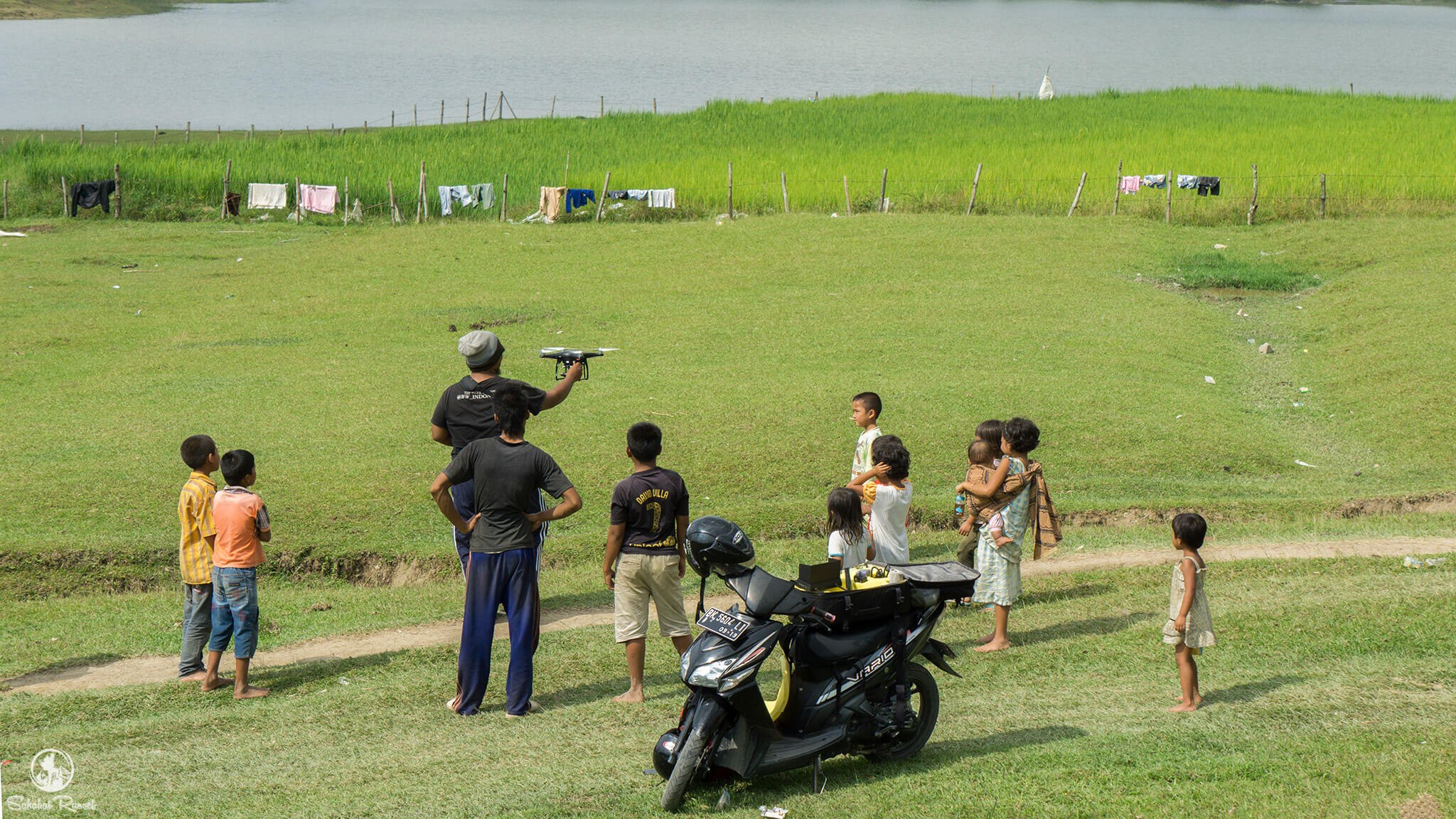 Pada awalnya, saya acuh saja dengan anak-anak kecil yang sepertinya sedang bermain pancing itu. Karena cuaca juga sedikit mendung, jadi saya harus segera mengambil foto udara. Daripada kedahuluan hujan, malah enggak jadi dapat view udara nih. Eh, ternyata ketika saya akan menerbangkan quardcopter saya, mereka tiba-tiba mendekat. Mungkin karena penasaran dengan benda terbang yang satu ini, ya? Berlanjutlah rasa penasaran mereka dengan saya. Mulai dari tanya namanya saya, hingga berebut minta gendong.